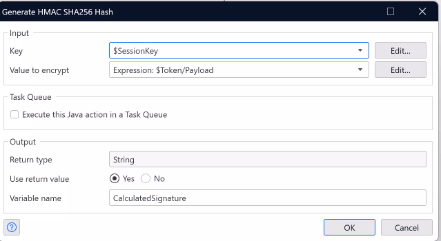 In order for us to create a valid Signature [S2] we need to know the Token Payload and the Sessionkey [S1]. If we explore the microflow, we see that the Token Payload is the first part of the Bearer token (the part before the .) So we can influence this. If we know the Session Key, then we can create a valid signature.